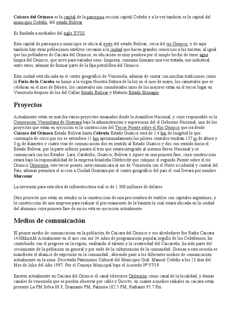 Caicara del Orinoco es la capital de la parroquia sección capital Cedeño y a la vez también es la capital del. municipio Cedeño, del estado Bolívar.